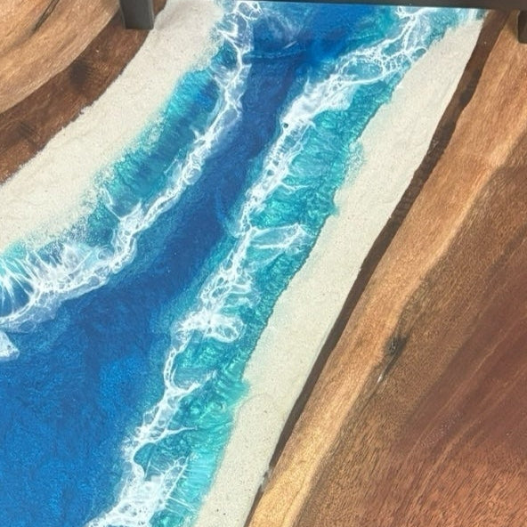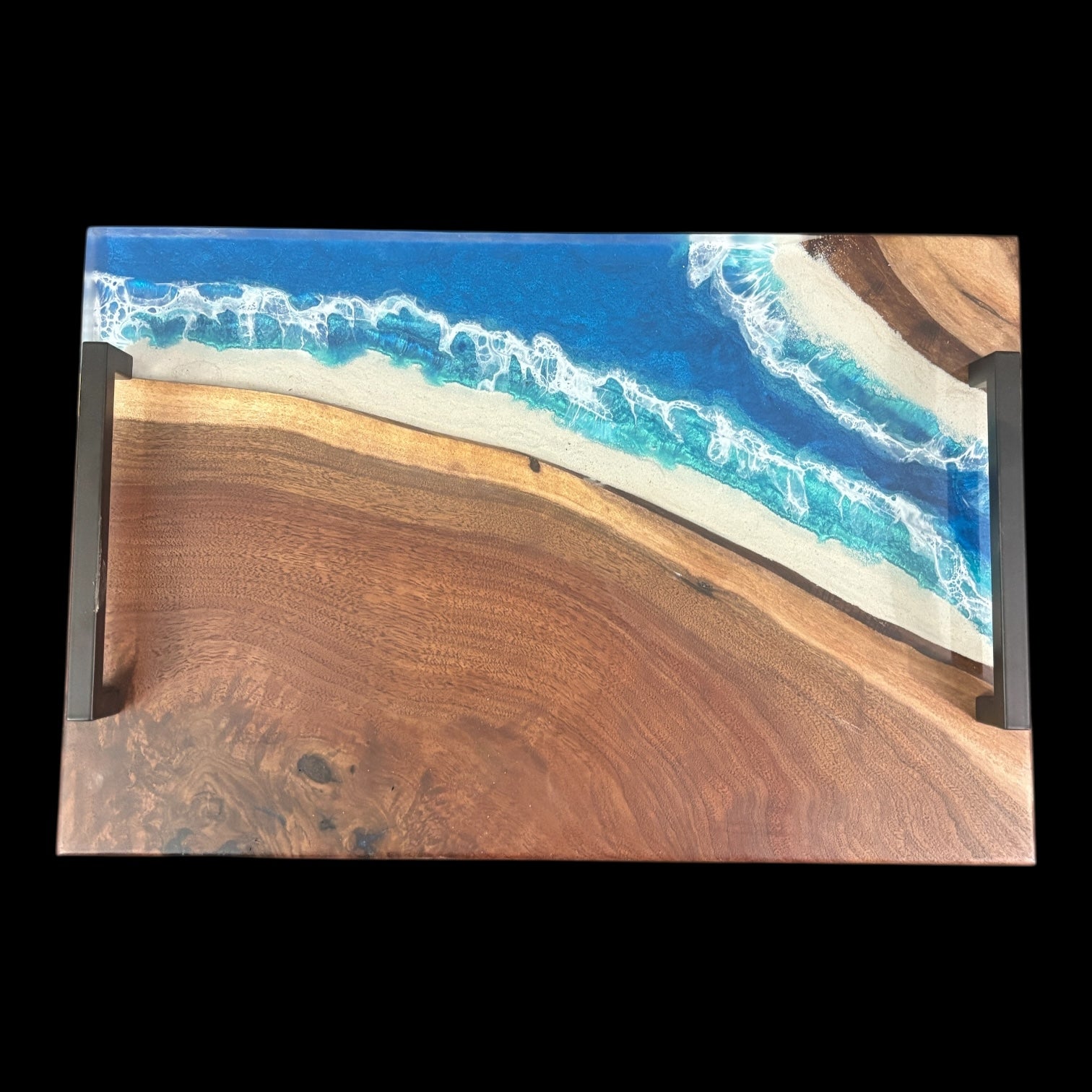 12" x 18" charcuterie board made from a beautiful piece of walnut. Then using a deep ocean blue epoxy, sandy beach and waves to finish the look. Accented by black metal handles and finished with a hard wax oil that is food and water safe. Handle color can be changed.